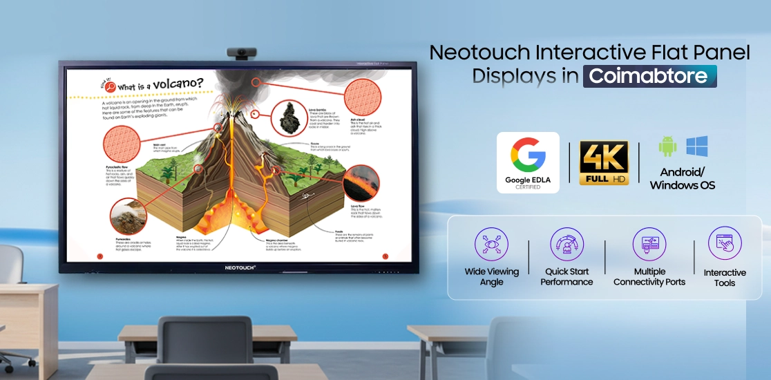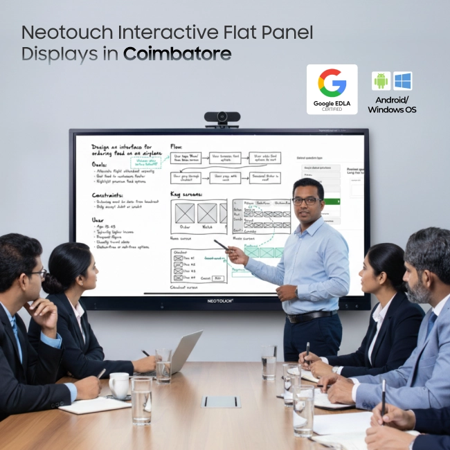Rising quickly in Coimbatore’s corporate hubs, IT parks, educational institutions, and industries, local teams need smarter ways to collaborate and communicate. Neotouch Interactive Flat Panels help companies, schools, and training institutes stay ahead with real-time interaction, clear presentations, and effortless teamwork. In Peelamedu and Saravanampatti, home to major IT parks and corporate offices, IFPDs streamline meetings, hybrid collaboration, and project presentations. In Kalapatti and Avarampalayam, key manufacturing and engineering zones, the smart board displays enable production planning, team coordination, and training sessions with precision. Educational institutions can use Neoutouch smart classroom solutions to make classrooms interactive, conduct virtual labs, and simplify complex lessons. Across these locations, Neotouch IFPDs enhance productivity, improve learning, save time, and reduce dependence on conventional boards and projectors, helping Coimbatore’s businesses and institutions stay connected, informed, and competitive.