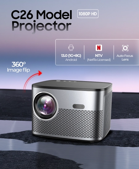 The C26 projector is a smart Full HD projection solution designed for home entertainment, educational environments, and professional presentations. Featuring Android 13.0 with Netflix licensed support, auto focus functionality, and high-brightness LED projection, it ensures seamless multimedia access and sharp visual performance. With flexible projection sizes, multiple mounting options, and built-in connectivity interfaces, the C26 delivers reliable viewing performance supported by long lamp life and stable system architecture.