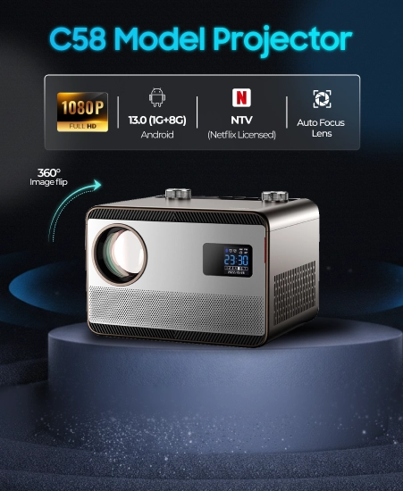 The C58 projector is a high-performance Full HD projection system designed for smart home entertainment, professional presentations, and large-screen viewing environments. Built with enclosed optical technology and a powerful LED lamp system, it ensures stable brightness, improved durability, and enhanced visual clarity. Equipped with intelligent automation features such as auto focus, auto keystone, and obstacle avoidance, the C58 delivers seamless projection performance with smart connectivity and efficient cooling technology.
