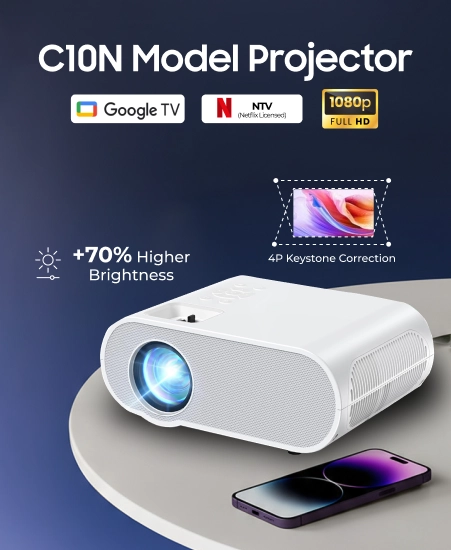 The C10N projector is a compact Full HD smart projection solution designed for home entertainment, personal viewing, and portable presentation needs. Equipped with Android 13.0, Google TV integration, electric focus, and automatic keystone correction, it ensures effortless setup and high-quality visuals. With stereo HiFi speakers, multiple connectivity interfaces, and enhanced brightness performance, the C10N delivers sharp images and immersive audio while maintaining lightweight portability for flexible usage environments.